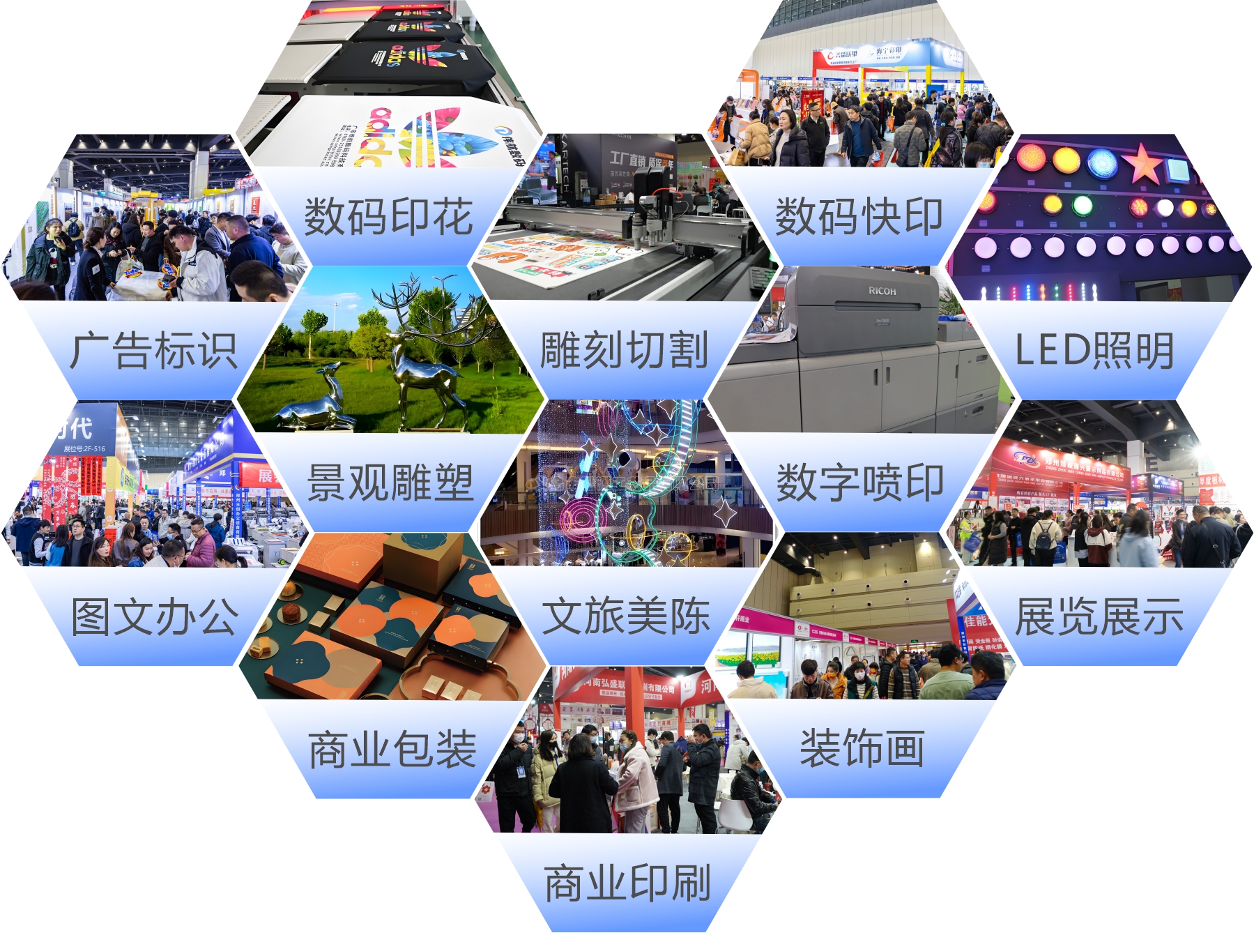 展會展品范圍涵蓋了廣告標識、LED照明、噴印、印花、雕刻切割、圖文辦公、商業(yè)印刷與包裝、數(shù)碼快印、影像、裝飾畫與框業(yè),為眾多品牌進入河南及中北部市場提供了機遇,更為河南及中北部市場帶來了全球采購的絕佳平臺。