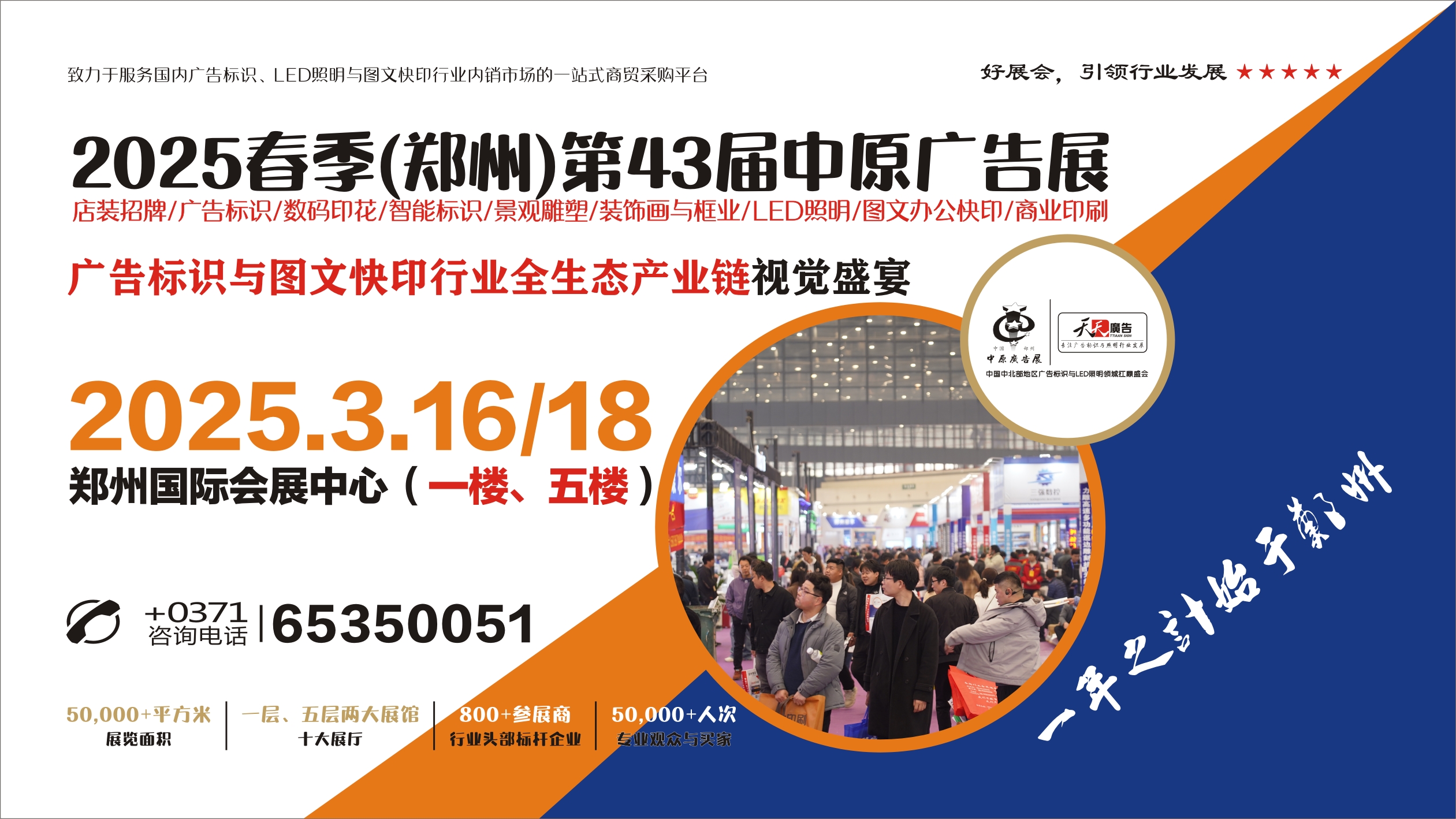 盛況再啟,精彩不斷續(xù)新篇!3月16日,鄭州國(guó)際會(huì)展中心,讓我們相聚2025春季(鄭州)第43屆中原廣告展暨2025中部(鄭州)裝飾畫與畫框及軟裝裝飾展,攜手并進(jìn) 共贏未來,一起再譜廣告新篇章!