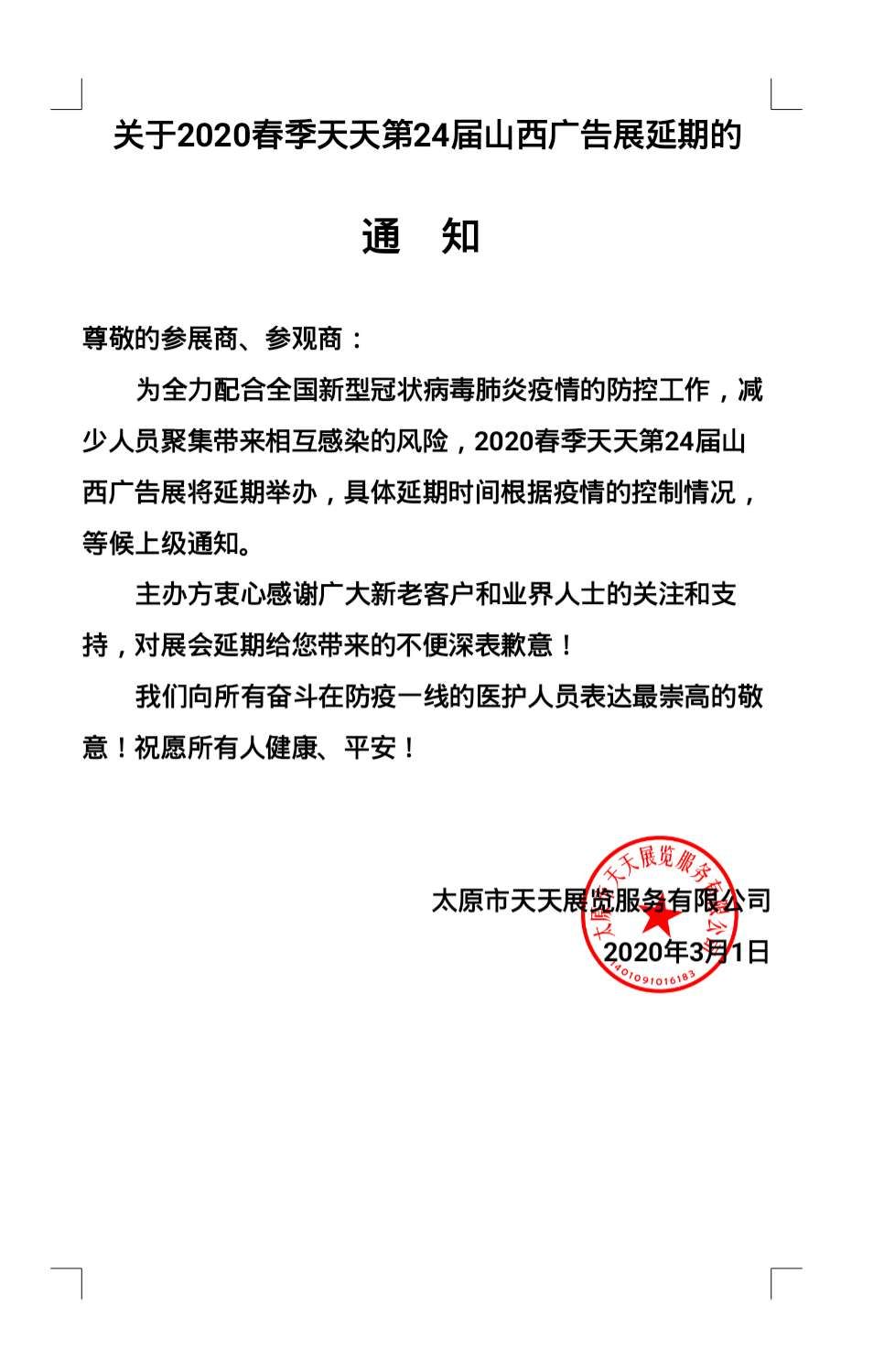 關于2020春季天天第24屆山西廣告展延期的通知