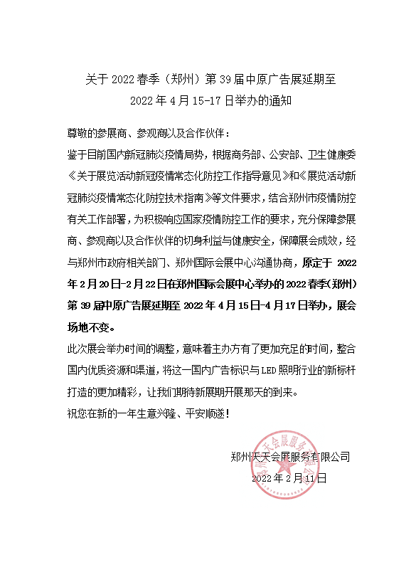 根據(jù)近期國內(nèi)新冠肺炎疫情形勢,為積極響應(yīng)國家疫情防控工作的要求,充分保障參展商、參觀商以及合作伙伴的切身利益與健康安全,鄭州天天會展服務(wù)有限公司將原定于今年2月20-22日舉辦的2022春季(鄭州)第39屆中原廣告展延期至4月15 -17日進行,展會原定場地不變。